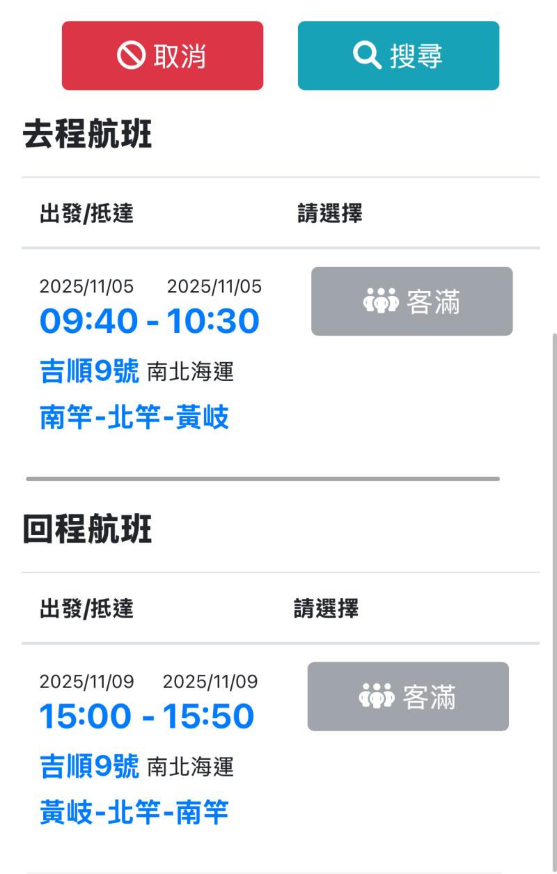 南竿往黃岐航線再現搶票潮!根據訂票系統顯示,11月5日出發、11月9日返程的船票早已全數售罄,距離航期尚有一個月就已客滿,讓不少有出行計畫的民眾措手不及。