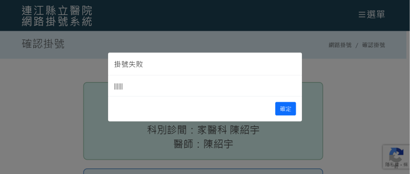 縣醫的網路掛號頁面是否又掛了?點進要掛號的醫生,輸入基本的資料,就跳出掛號失敗訊息,昨天就開始這樣,