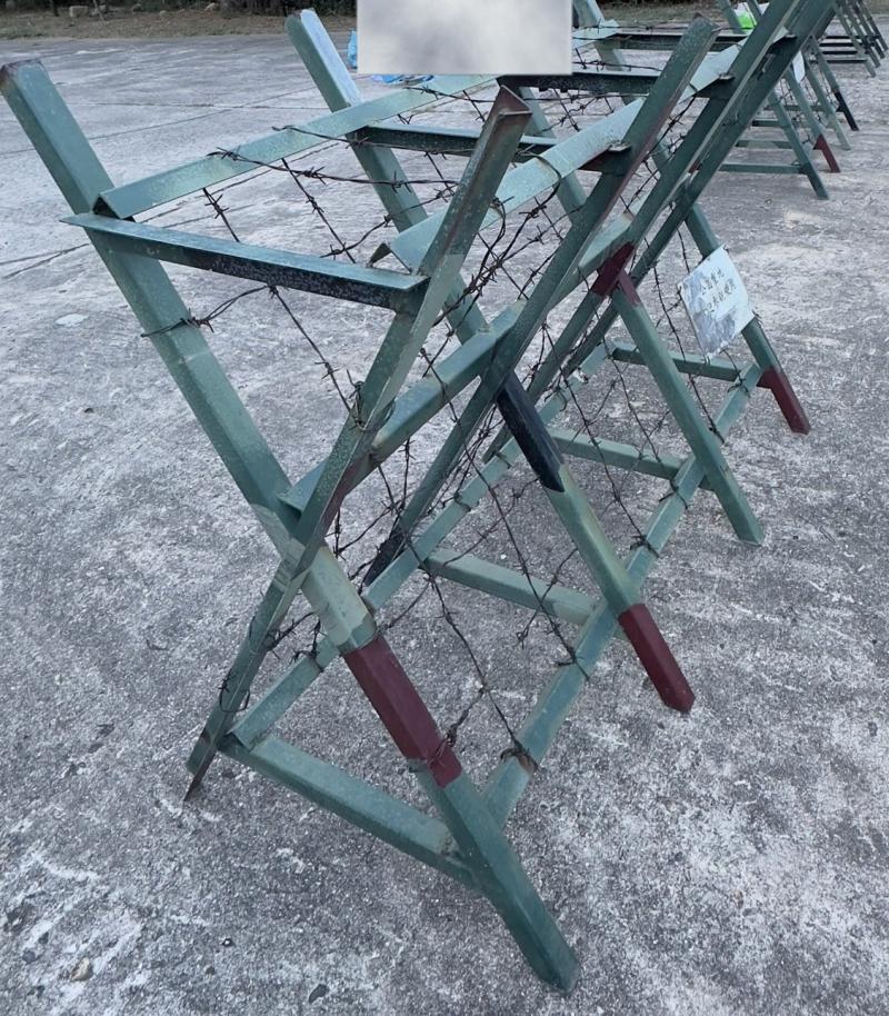 公園路口放置了一排有生鏽鐵刺的鉅馬