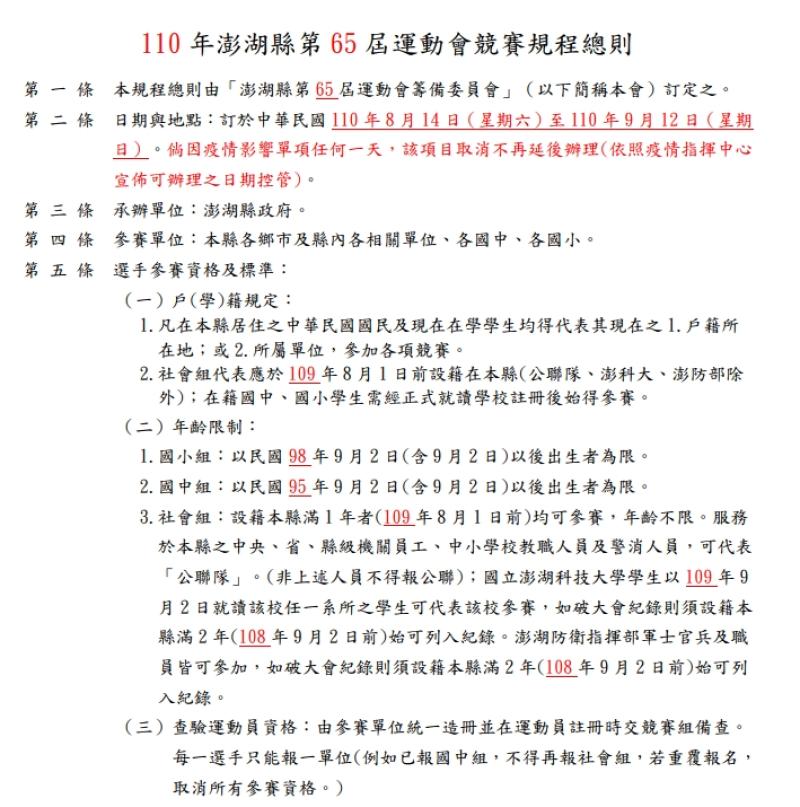 為回應各界期待,並確保即將舉辦的離島運暨縣運賽事,期能真正落實提升縣內運動風氣、增進鄉親交流之核心目的,我們預計於年後,參照澎湖、金門及本縣特性,邀請本縣四鄉(南竿、北竿、莒光、東引)相關人員針對參賽選手資格進行最終決議。