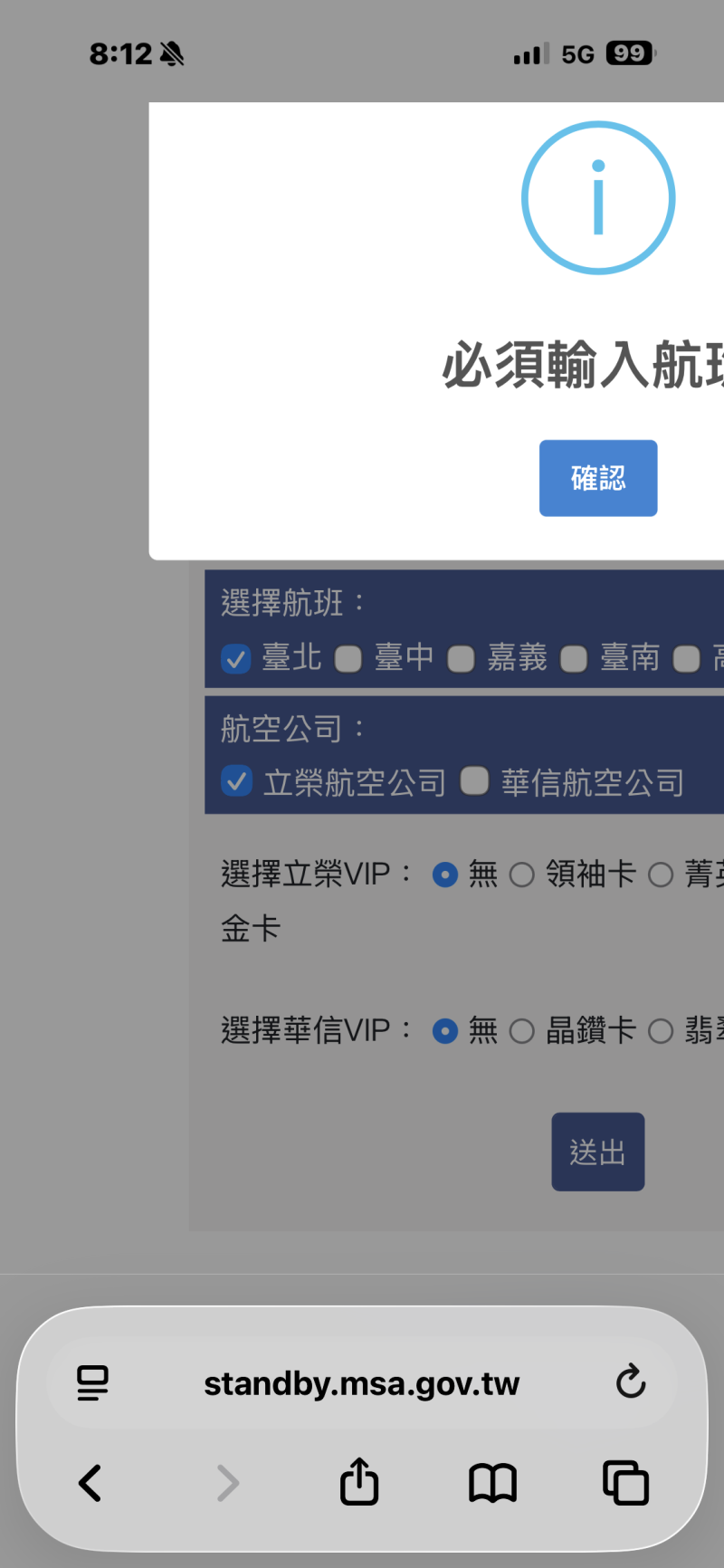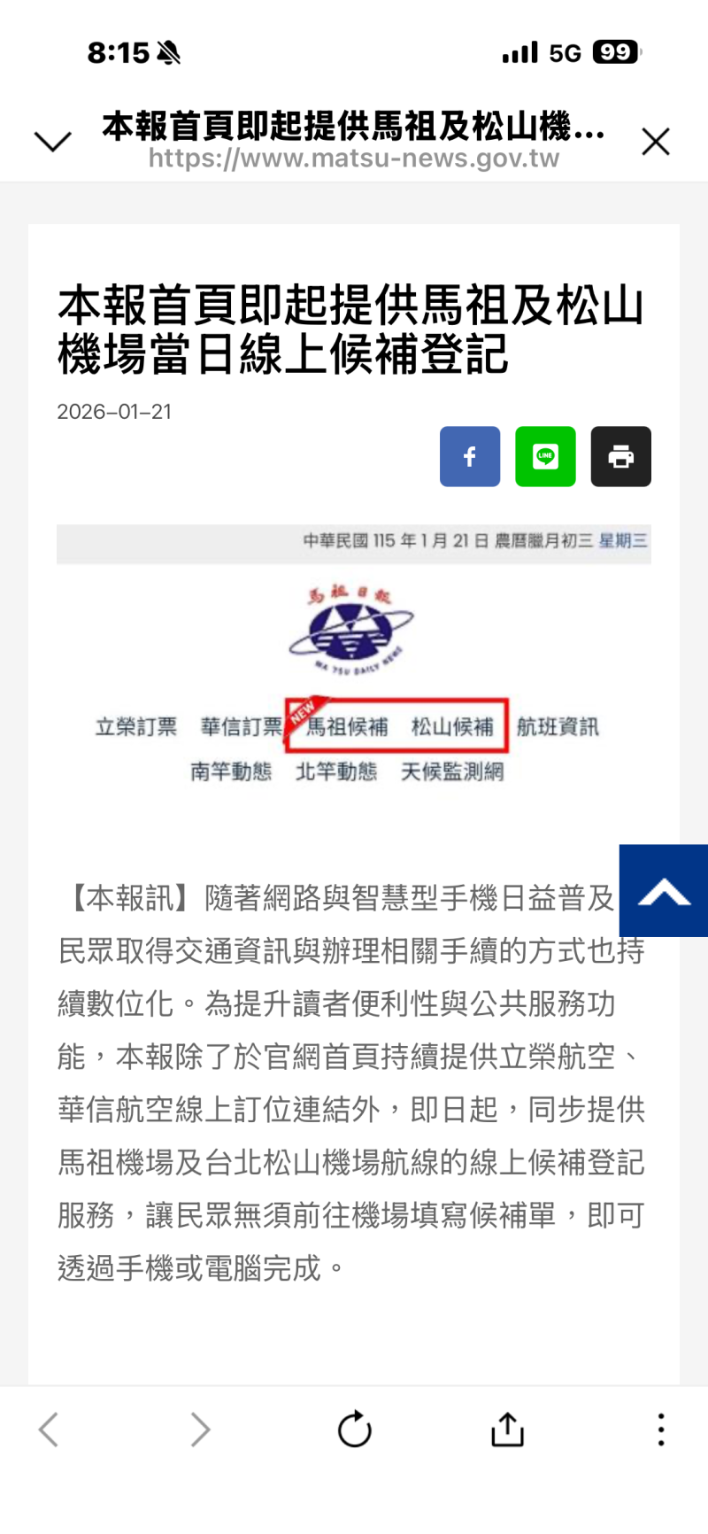 您好: 您所提的操作問題已轉知馬祖航空站。 本報10:55分測試已順利完成線上候補登記"85"號。 也歡迎讀者網友持續提供操作回饋,讓系統更加完善。