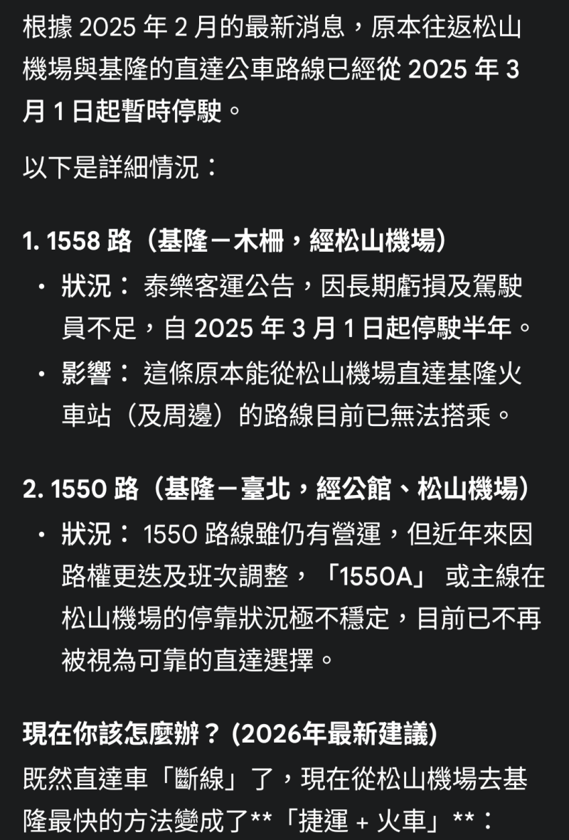 感謝網友的關心: 一、 113年4月本局已致電汎航客運及國光客運業者,因載客量不足故停駛。 二、 目前松山機場附近捷運站可轉乘松山機場有以下兩種選擇: 1. 劍南路捷運站-日豪客運1573線(內湖科技園區-國道1號-基隆): 民眾可從松山機場捷運站上車搭乘2站即達劍南捷運站,由劍南路捷運站3號出口步行2分鐘,達美麗華(植福)公車站後,轉乘日豪客運往基隆火車站。 2. 南京復興站-國光客運1802路線(三重運動場-基隆客運站): 搭乘文湖線至南京復興站(兄弟大飯店斜對有站牌),可轉乘直達基隆客運站。 三、 本局將持續協請陳立委服務處爭取松山機場直達基隆客運需求。 連江縣交通旅遊局 敬啟