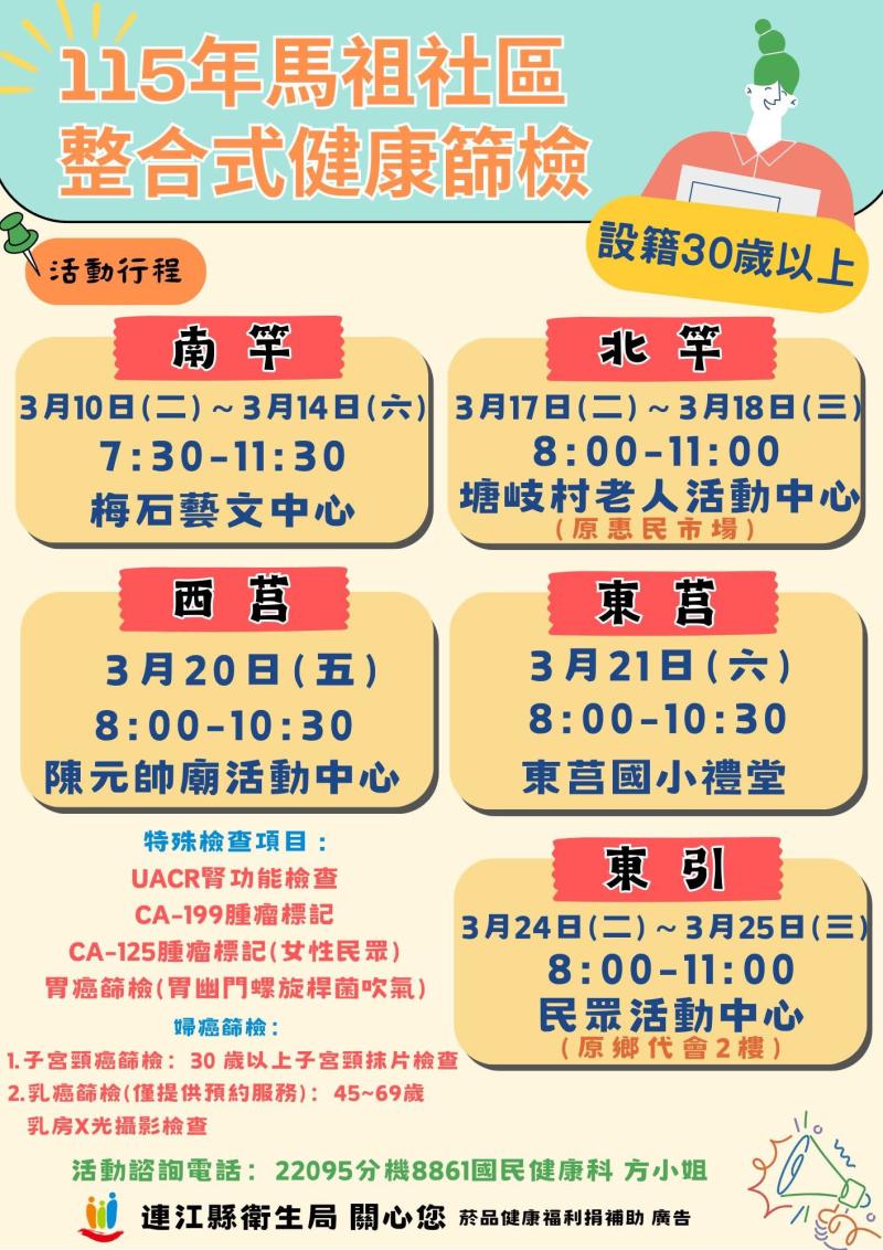 今年預約報名將運用本局「健康馬祖」平台,尚未註冊的鄉親可先完成註冊,註冊完成後可在個人健康數據中查詢到114年整合式健康篩檢報告數據資料(點選『首頁』登入平台_點選『OOO的健康數據』_點選『生命與健康數值』_點選『成人健檢』即可查詢114年健檢報告)。敬請鄉親多加利用。
