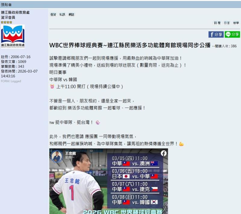 感謝鄉親熱心查詢 針對有關「縣政府經典賽轉播違法?」之不實指控,特此說明: 連江縣政府辦理本次世界棒球經典賽公共轉播活動,已取得公開播放授權。依據九太科技股份有限公司所出具之授權書,授權期間為115年1月1日至115年12月31日,連江縣政府得於推廣體育及相關活動之目的範圍內,進行公開播放。 因此,本次於公共場域辦理賽事轉播活動,均屬合法授權範圍內之行為,並無任何違法情事。 在未查證事實之前,即公開散布「縣政府違法」等不實言論,已嚴重損害縣府名譽,也對辛苦籌辦活動的同仁造成不公平的指控。敬請相關人士停止散布不實訊息,並應負起言論責任,網路列表只是部分公開名單,並不是全部授權單位。 如果只看名單就直接下結論,可能就像只看第一局就宣布比賽結束一樣。 放心,看球合法。 畢竟經典賽是要看棒球,不是看誤會的,大家一起專心為中華隊加油比較重要 連江縣政府辦理本次活動,目的在於讓鄉親共同為中華隊加油、凝聚地方情感,也歡迎大家一起進場支持。