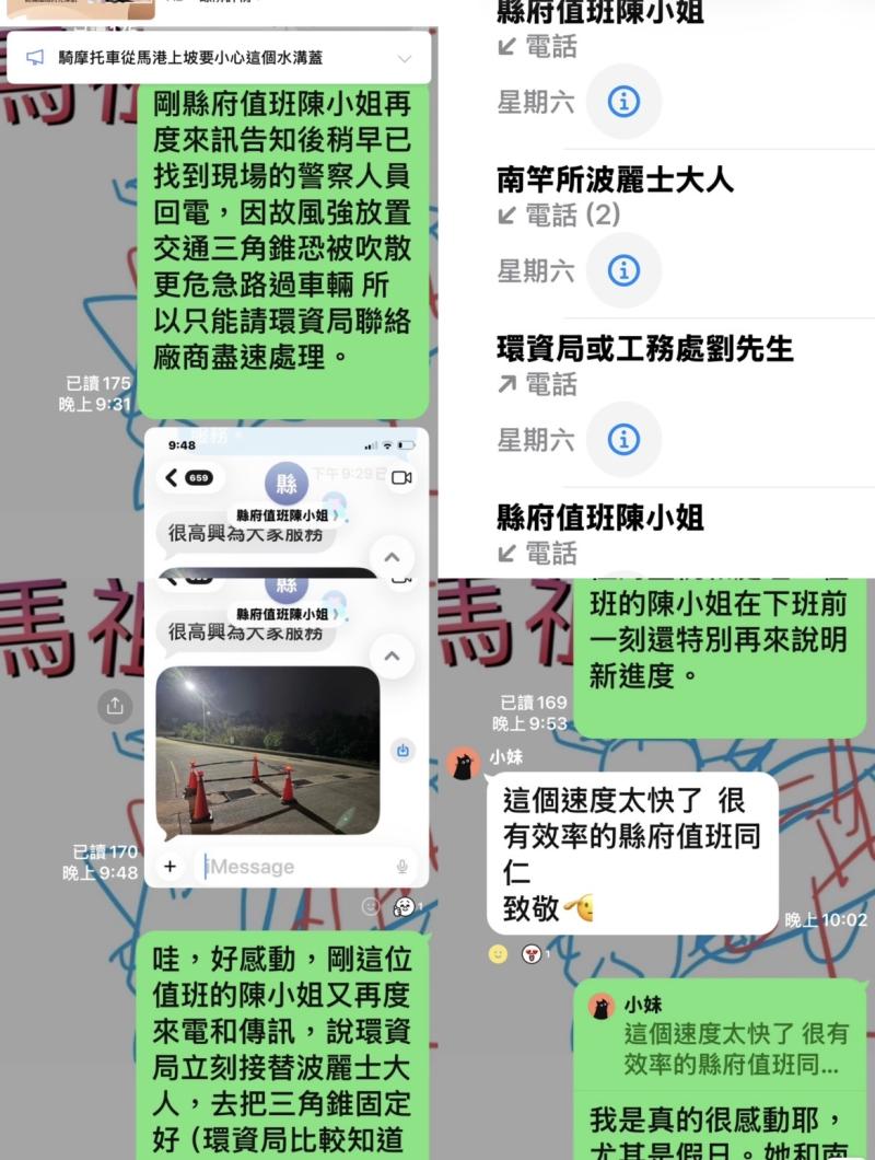 此時,已經很肯定受理的幾個單位是迅速積極回應民眾的通報,也理解當時時間已晚,臨時處理不易,且第一通首通報縣府值班台時,社群管理群並沒有留自己的姓名,值班人員也不知道是來自社群的民眾反映,仍如此重視。