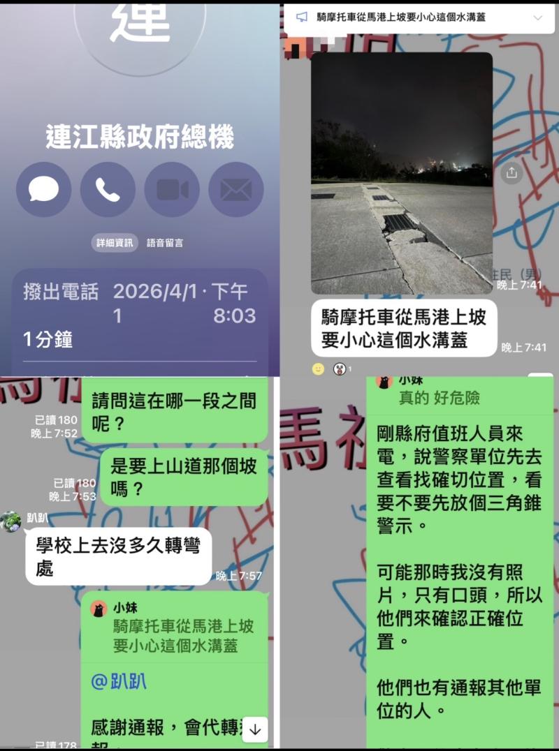 星期六晚上快八點,Line社群《馬祖道路安全,路況通報群》,由熱心民眾「小妹」將拍到路況有安全疑慮的照片上傳示警後,看到的社群管理群,如有即時看到,會視情況緊急與否而代為通報公家,在確認正確地點後,經由正常程序去電通報縣府值班人員。