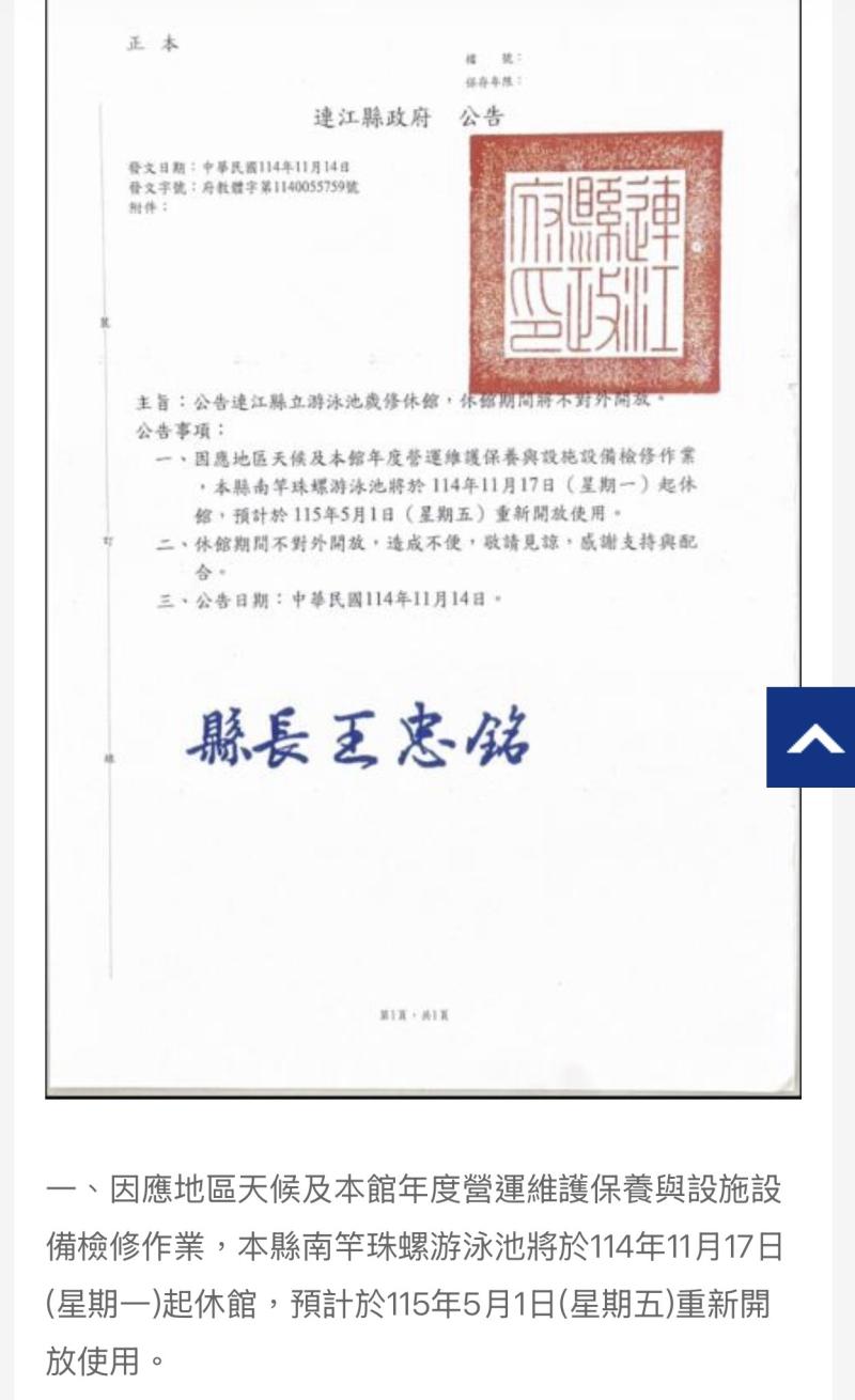 目前經評估,因馬祖5月初氣候仍偏涼,水溫較低,加上各校游泳課程尚未正式開始,救生及管理人力也需配合實際使用需求調度,5月1日恐無法如期全面開放。