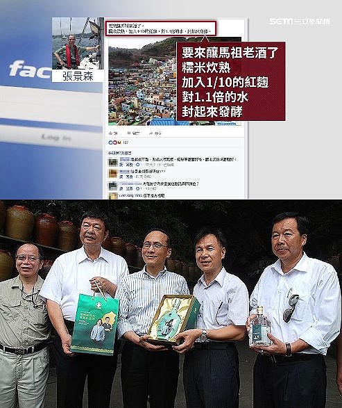 上圖:張景森在臉書PO文比照民間家戶自釀馬祖老酒自飲。(圖:截圖三立新聞);下圖:政務委員兼福建省主席張景森(左1)今年8月13日陪同閣揆林全到馬祖訪問,參觀八八坑道儲酒區。(圖:馬祖日報資料照片)