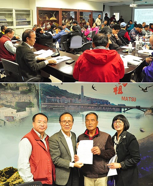 針對是否放寬雇用大陸漁工船距岸50公尺外作業,漁業署、連江縣政府昨日舉行政策協調會;區漁會理事長劉鴻君向漁業署長陳添壽遞交陳情書,表達反對意見。(圖/文:馮紹夫)