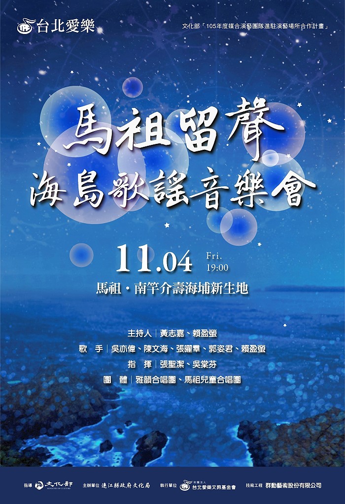 《海島歌謠音樂會》由縣府文化局舉辦、愛樂劇工廠策劃製作,將於11月4日晚間7時於南竿介壽澳口公園演出,免費入場,歡迎鄉親及來馬旅遊、參賽的貴賓前往欣賞。