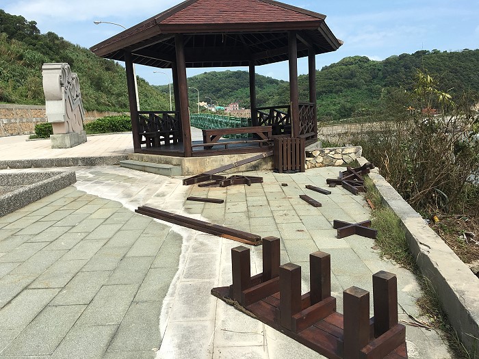 不敵強風吹襲,田澳景觀步道發呆亭被吹得七零八落,鄉親期盼早日修復。(圖/文:宋幸儒)