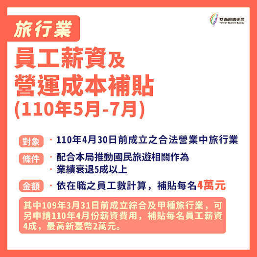 1、旅行業員工薪資及營運補貼:補貼對象為110年4月30日前成立合法旅行業,於補助期間內任1個月營業額較108年同月或110年任1月衰退比率達50%以上者,依在職員工且投保勞工保險達1個月人數,一次補貼1季(5、6、7月)以每人4萬元計算;其中109年3月31日前成立的綜合及甲種旅行業,可另申請補貼110年4月份薪資費用,補貼員工薪資四成,最高上限2萬元。