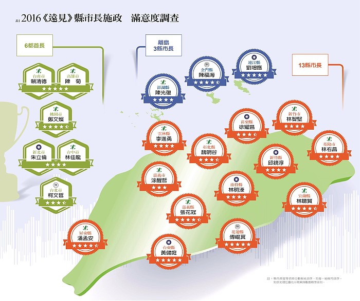 《遠見雜誌》有鑑於六都、本島和外島,無論人口、資源、財力,都有或多或小的差異,為讓評比更公平,今年評比首度將22位縣市長分為3組,6都、本島13縣市,以及外島3縣。結果發現,最受關注的「5星俱樂部」,多半是「老班底」。六都組由台南市長賴清德和高雄市長陳菊蟬聯,而本島13縣市還是花蓮縣長傅崐萁與台東縣長黃健庭的天下,連江縣長劉增應是外島組中的唯一新秀。