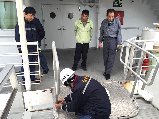 馬祖連江航業加強「臺馬之星」運作細節察看,登輪梯使用的船舷卡板螺絲更換,讓卡板在下船時順暢銜接。(圖:本報編輯部)