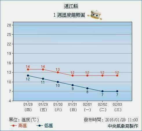 根據中央氣象局資料,今日鋒面影響,水氣最多,未來數天外島地區易有低雲及局部濃霧,可能影響對外交通。30至31日鋒面通過及東北季風影響,多雲時陰局部零星短暫雨,偶爾可見陽光。此外,未來一週氣溫呈現下降趨勢,尤其是31日起受大陸冷氣團影響,2月2日至3日低溫預報7度,請民眾注意防寒保暖。