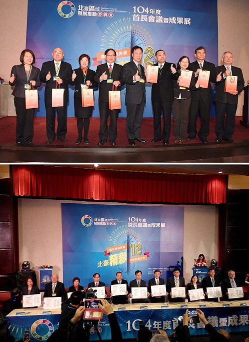 昨日上午10時於交通部鐵路改建工程局國際會議廳舉行由新北市政府主辦的104年首長會議暨成果展,對外展示相關合作成果,行政院政務委員林政則與各縣市由首長或委派代表出席會議。北臺區域發展推動委員會是民國94年起由臺北市、新北市、宜蘭縣、基隆市、桃園市、新竹市、新竹縣、苗栗縣等8個縣市為進行經貿、文化、醫療等交流而組成,長年相互合作,成果豐富,今年為擴大合作交流區域,與金馬澎離島3縣組成的離島區域合作平臺簽署合作備忘錄,加強各縣市之間合作,並增加相互經驗交流。