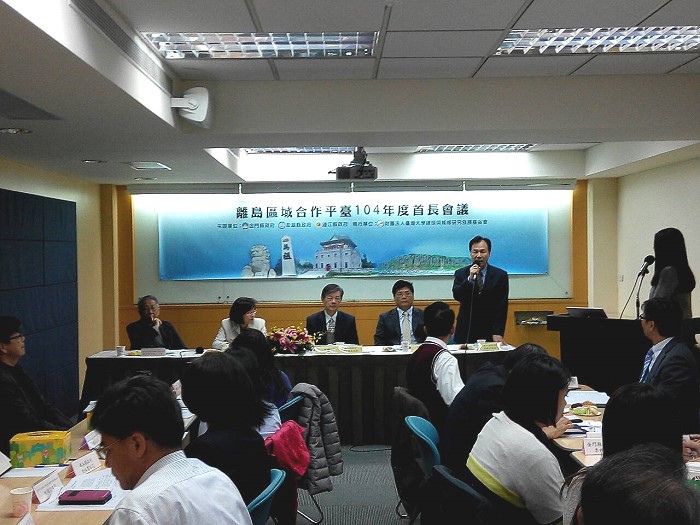 金門、連江及澎湖縣府聯合組成離島區域合作平臺昨日下午2時30分在臺大校友會館三樓3A會議室召開離島區域合作平臺104年度策略規劃暨輔導執行計畫-首長會議,由今年主辦的金門縣長陳福海擔任主席,澎湖縣長陳光復及連江縣長劉增應均與會,一起對外說明離島平臺具體工作成果。連江縣參加主管有教育局長陳冠人、工務局長劉潤南、建設局長劉德全、財政局長林貽德等相關局室出席。