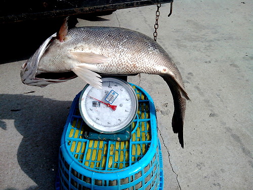 漁民定置網捕獲季頭大尾鱸魚,體型都在十斤以上。(圖/文:陳鵬雄)