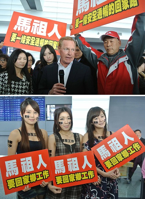 馬祖開發案延宕,打算在馬祖投資的業者14日搭機來台,上百鄉親在桃園機場舉牌接機。(圖:中央社)