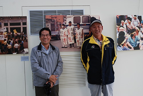 當年為了金、馬解除戒嚴抗爭走上街頭,被限制返鄉的金門翁明志與馬祖王長明,昨天在民主運動回顧展中,笑容可掬的與當年清澀但勇氣十足的自己合照,還真人現身說法為現場中正國中小學生上了一堂民主珍貴的一課。