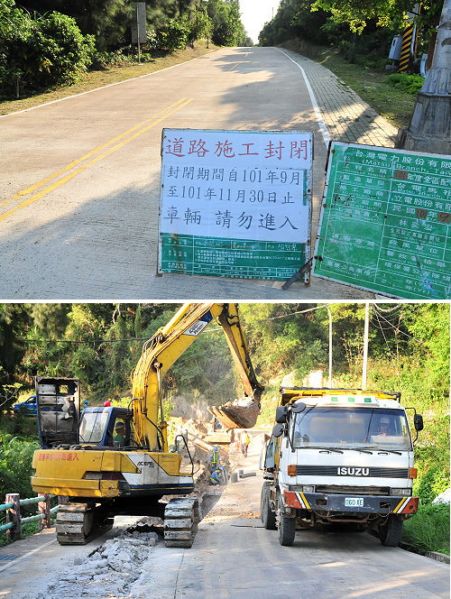 津沙村從靶場至津沙公園路段已封閉施工,目前先由台灣電力公司進行配電管路工程及零星外線工程現在積極開挖趕工,由於採全線封閉,請駕駛人配合改道行駛,此路段連同養護期預定11月中旬可完成。(圖/文:曹重偉)