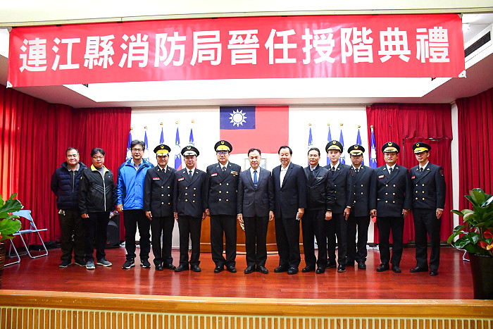 【記者曹重偉報導】光榮時刻,連江縣消防局2日於該局禮堂舉辦110年晉升授階典禮,由縣長劉增應為晉升人員配授新階,晉升人員包括局長曹典鈺(授予3線2);副局長王傳龍、秘書黃春雄(授予3線1);大隊長洪明全、科長陳鈞瑋(授予2線4);副大隊長陳順官、副大隊長林浩然(授予2線3)。劉增應與議長張永江等恭賀晉升者,期許承擔更重責任與使命,珍惜此份得來不易殊榮,秉持務實的態度,在工作崗位上全力以赴,肩負守護縣民責任。