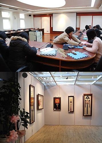 雖然來不及舉辦開幕茶會,但昨天經過一天的作業,「結祥迎春-千容結藝馬祖聯展」已經順利佈展完成,展出作品絕對讓人跳脫以往對中國結的印象,除了運用傳統棉、麻、絲、線等繩材以外,也廣泛的使用尼龍、金屬線等媒材,配件方面則使用玉石、珍珠、琉璃、蜜臘、綠松石、景泰藍、銀飾、銅飾等,其風格在華麗自然、裝飾與實用、現代與傳統間尋求平衡,充份展現濃厚的人文氣息與細緻的結藝功力。