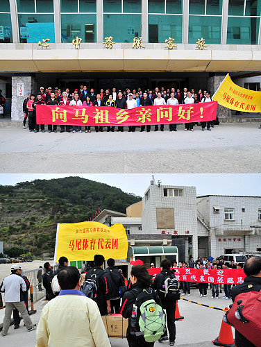 「2011兩馬體育文化交流活動」登場,馬尾體育交流訪問團在馬尾區區委常委兼宣傳部長及教公委書記張學勇帶領下,率領包括各項選手、幹部及工作人員一行63人翩然抵馬,還拉起「向馬祖鄉親問好」的大布條。(圖/文:曹重偉)