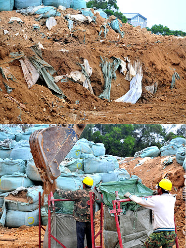 聯勤司令部發包「廢電池場址有害廢棄物清理暨土壤整治」工程,由捷博公司得標,頭號重點就是將遭污染泥土全數完成清運;去年遭踢爆部分污染土封袋嚴重破裂外露,廠商也進行補救重新裝袋。(圖/文:曹重偉)