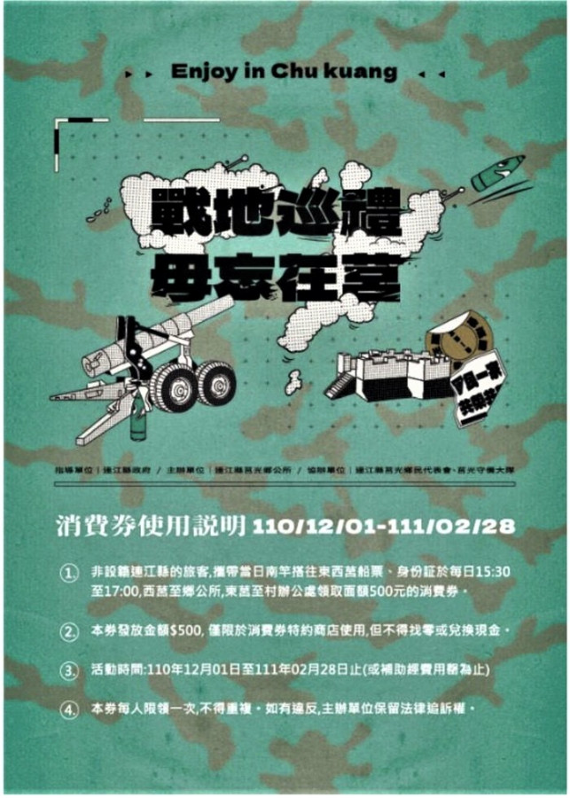 ◎莒光鄉公所再推莒光2021海洋觀光年秋冬消費券,活動時間自110年12月1日到111年2月28日凡非設籍連江縣的旅客,攜帶當日南竿搭往東西莒船票及身分證於每日下午15:30至下午17:00,西莒至鄉公所,東莒至村辦公處領取面額500元消費券名額1000名。