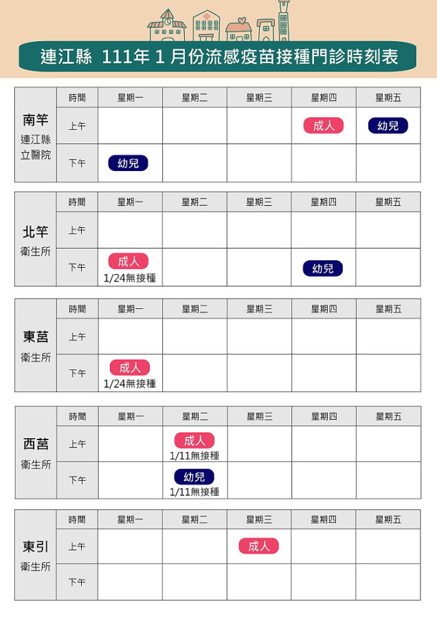 北竿衛生所:成人-1月10日(一)下午、1月17日(一)下午;幼兒-每週四下午。