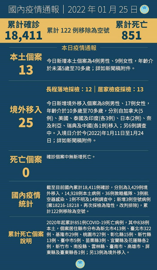 指揮中心說明,25日新增本土個案為4例男性、9例女性,年齡介於未滿5歲至70多歲。25日新增境外移入個案為8例男性、17例女性,年齡介於10多歲至70多歲,分別自加拿大(5例)、美國、泰國及印度(各3例)、日本(2例)、奈及利亞、瑞典及中國(各1例)移入;另6例調查中。入境日介於今年1月11日至1月24日。