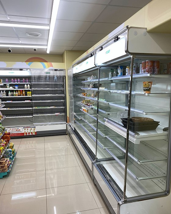 台馬長程船班停航時間超過一週,東引便利商店陳列牛奶、即食食品的貨架幾乎已被清空。(圖/文:陳其敏)