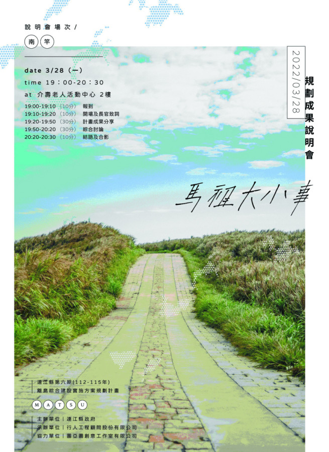 為公眾周知,縣府舉辦實施方案(草案)成果說明會,內容將聚焦未來馬祖整體發展策略及六期綜建實施方案規劃計畫草案內容進行說明,期藉由說明會,與鄉親進一步回饋交流,供後續精進地方發展之依據,確實落實「離島建設業務檢討及改進方案」與「促進離島永續發展方針」之離島建設規劃。