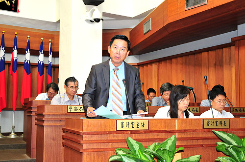 審計部台灣省基隆市審計室主任張錦堂來馬進行九十九年度總決算暨附屬單位決算審核報告,並仔細答覆議員提問。(圖/文:曹重偉)