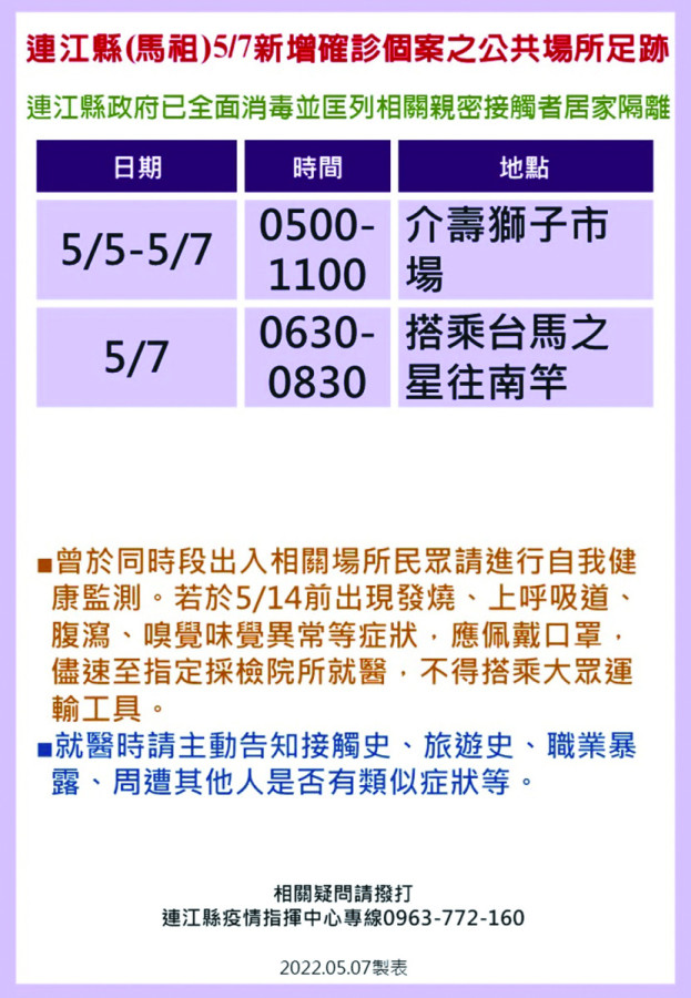 指揮中心呼籲曾於同時段出入相關場所民眾,請進行自我健康監測;若於5月14日前出現發燒、上呼吸道、腹瀉、嗅覺味覺異常等症狀,應佩戴口罩,儘速至指定採檢院所就醫,不得搭乘大眾運輸工具。就醫時請主動告知接觸史、旅遊史、職業暴露、周遭其他人是否有類似症狀等;相關疑問請撥打連江縣疫情指揮中心專線:0963-772160。