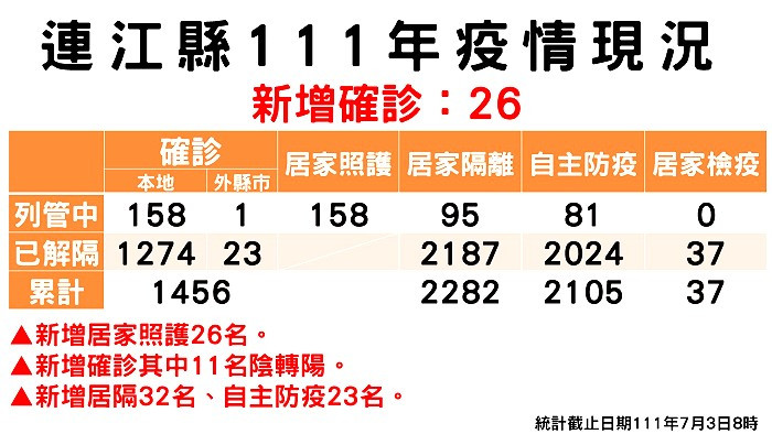 3日新增26名確診 南竿12、北竿8、東引5、西莒1