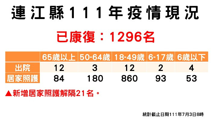 指揮中心統計,本縣今年累計確診1456名,列管個案159名,住院治療1名,居家照護158名(新增26名),個案病況皆穩定,已有1296名病患康復解除隔離出院;居家隔離新增32名,共列管95名;自主防疫新增23名,共列管81名。每日公告確診個案為縣立醫院及各衛生所通報案例;發生於地區的所有個案,縣立醫院與衛生所均會收案,給予完整醫療照護。