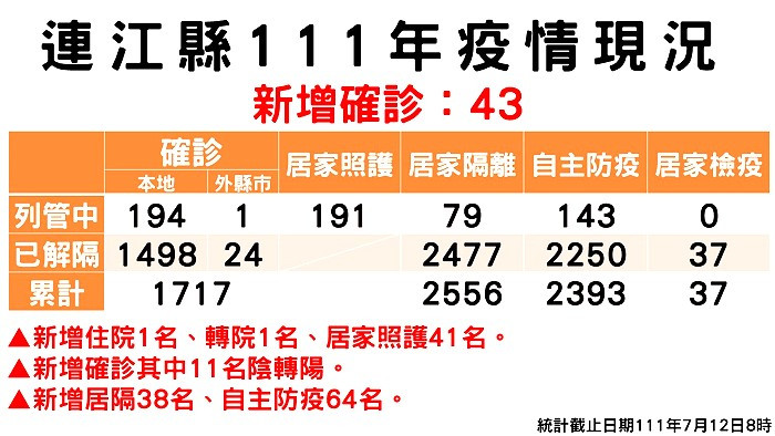 指揮中心12日公布新增43名確診,案例分布南竿鄉24例、東引鄉11例、北竿鄉6例、莒光鄉2例(西莒1、東莒1)。(圖:連江縣疫情指揮中心)