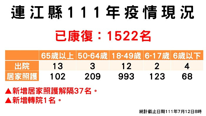 指揮中心統計,本縣今年累計確診1717名,列管個案195名,住院治療4名(新增住院1名、轉院1名),居家照護191名(新增41名),個案病況皆穩定,已有1522名病患康復解除隔離出院;居家隔離新增38名,共列管79名;自主防疫新增64名,共列管143名。每日公告確診個案為縣立醫院及各衛生所通報案例,發生於地區的所有個案縣立醫院與衛生所均會收案,給予完整醫療照護。