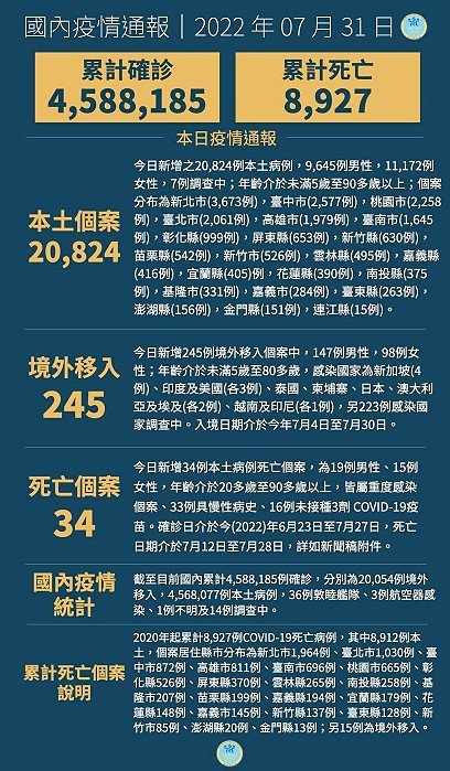 指揮中心指出,31日新增34例本土病例死亡個案,為19例男性、15例女性,年齡介於20多歲至90多歲以上,皆屬重度感染個案、33例具慢性病史、16例未接種3劑 COVID-19疫苗。確診日介於今年6月23日至7月27日,死亡日期介於7月12日至7月28日。