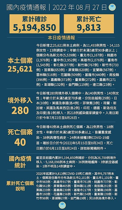 指揮中心指出,27日新增40例本土病例死亡個案,為22例男性、18例女性,年齡介於未滿5歲至90多歲以上,皆屬重度感染、38例具慢性病史、24例未接種3劑COVID-19疫苗。確診日介於今年5月15日至8月24日,死亡日期介於6月11日至8月24日。