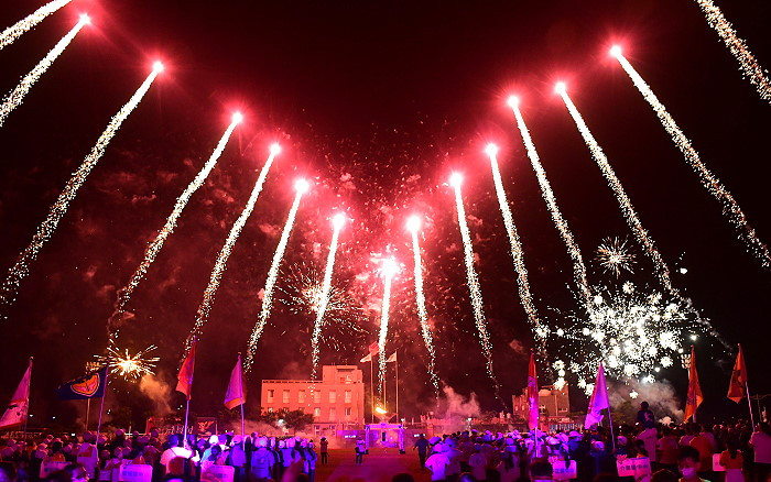 111年縣運會開幕典禮3日晚間在福澳運動場歡樂引爆,副縣長王忠銘以辦喜事心情迎接來賓及鄉親到來,煙火秀等演出獲得來賓高度讚許。(圖/文:曹重偉)