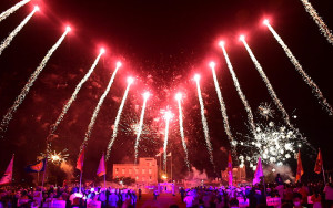 大會聖火今年別開生面,邀請拳擊好手陳念琴與四鄉鄉長一起慢跑,繞行半圈到司令台前會合後,轉身跑向聖火台,5人一起點燃,霎那間煙火齊放,五彩繽紛的煙火在夜空恣意綻放,讓現場氣氛衝到最高潮。
