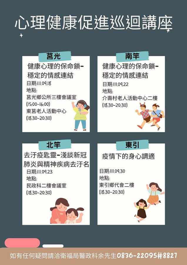 衛福局心理健康促進巡迴講座 22日南竿、23日北竿、30日東引