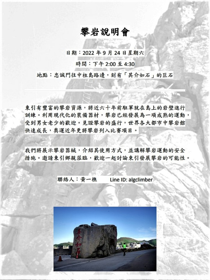 我們將展示攀岩器械,介紹其使用方式,並講解攀岩運動安全措施,邀請東引鄉親共同討論東引發展攀岩的可能性。