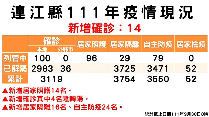 30日新增14名確診 南竿9例、北竿3例、西莒1例、東引1例