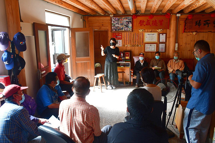 保存木工技藝及傳承,文化處9日舉辦大木作技術保存紀錄及匠藝傳習,邀請登錄為本縣文化資產技術保存者陳元元主講,潘建國口譯。(圖/文:曹重偉)