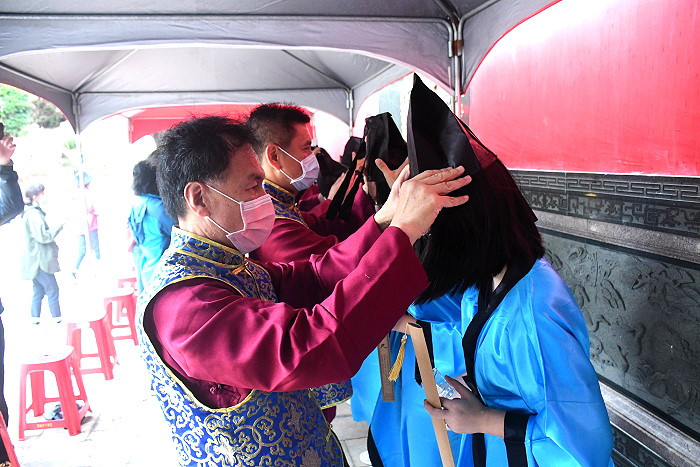 牛角做出幼成年禮隆重舉辦,家長來賓一起見證馬中一年級93位學子成年禮;完成過關儀式後,由縣長劉增應等來賓為同學加冠。(圖/文:曹重偉)