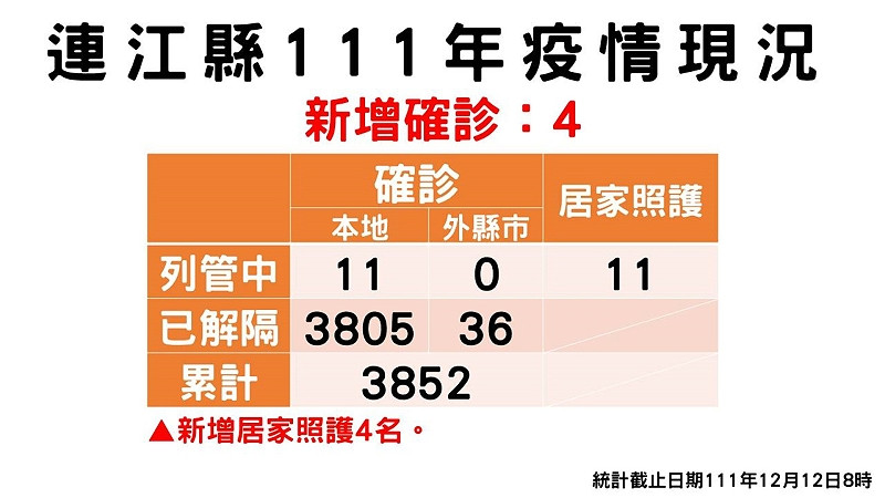 12日新增4名確診 南竿3例、東引1例 累計3841位康復解隔